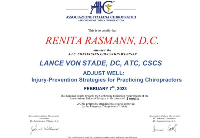 La partecipazione al seminario del DC Lance Von Stade ha permesso a Renita Rasmann D.C. di comprendere al meglio quali possono essere delle strategie per prevenirsi da infortuni sul lavoro come chiropratica. Lei aspetta con ansia il seminario dell’AIC in primavera (25-26.03) che approfondirà l’argomento.