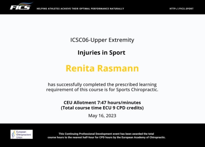 Quando ho dei momenti liberi tra l’allestimento del mio studio e l’apprendimento dell’italiano, continuo con i miei studi di Chiropratica Sportiva Internazionale presso la FICS.